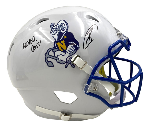 Featured is a Robert O'Neill signed Navy full size authentic speed helmet, inscribed "Never Quit". This helmet has been hand signed by O'Neill and comes with the PSA hologram and certificate of authenticity. This helmet would make a great addition to any entertainment memorabilia collection! SPECIFICATIONS Autographed By: Robert O'Neill Team: Sport: Authentication: Professional Sports Authenticator (PSA)