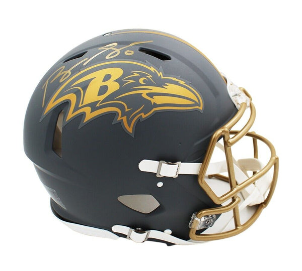 A Baltimore Ravens Speed Authentic Slate NFL Helmet hand signed by Roquan Smith. The item and signature are in excellent condition. Roquan played college football at Georgia and is a linebacker for the Baltimore Ravens. He was named MVP of the SEC Championship Game and was the first Georgia Bulldog to win the Butkus Award. AUTHENTICATION: Your item has been tagged with a SmarTag Powered by Prova Technology, which gives you digital access to your items authentication records, including a proof picture from the signing.