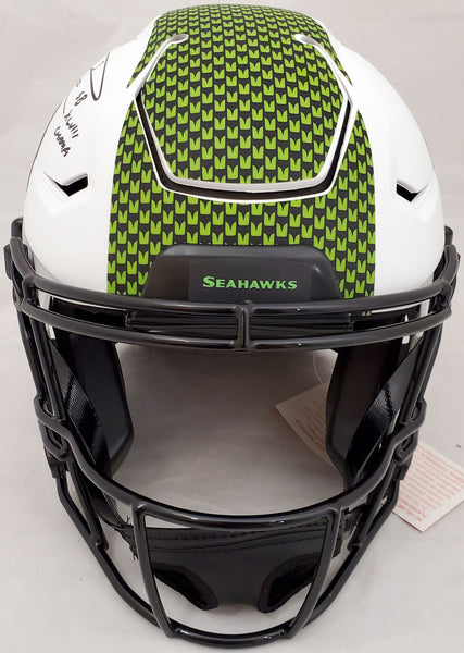This is a Seattle Seahawks Full Size White Lunar Eclipse Authentic Hyper Speed Flex Helmet that has been hand signed by Russell Wilson. This item has the official tamper-proof Russell Wilson serial numbered hologram and matching certificate of authenticity. A It has also been authenticated with the Beckett Witness certification, meaning both a representative from Beckett and Mill Creek Sports witnessed the signing. A It also comes with their sticker and matching certificate of authenticity. A NOTE: The Eclipse helmets are very delicate and often have some marks or scratches on them.
