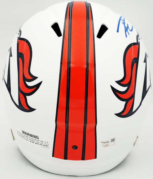 This is a Denver Broncos Flat Matte White Full Size Replica Speed Helmet that has been hand signed by Russell Wilson. This item has been certified authentic by Fanatics and comes with their tamper-proof sticker.