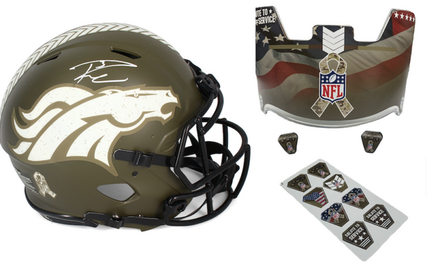 This denver broncos salute to service - military ribbon visor edition - authentic speed helmet has been personally hand-signed by russell wilson. it is officially licensed by the nfl and comes with an individually numbered, tamper-evident hologram from fanatics authentic. to ensure authenticity, the hologram can be reviewed online. this process helps to ensure that the product purchased is authentic and eliminates any possibility of duplication or fraud.the autograph includes an official fanatics hologram and matching coa for authenticity purposes.comes with a tamper-evident hologram from fanatics authenticatedofficially licensed by the nfl money back guarantee! if for any reason you are not completely satisfied with the quality or authenticity of your purchase, we will gladly give you a full refund or exchange, whichever you prefer up to 30 days after purchase. please feel free to e-mail us with any questions. good luck bidding!!! authenticator pre-certified authenticator: fanatics authenticated history of item: russell wilson has signed this item in the presence of a representative from fanatics. describe how you came to possess this item: super sports center is a fully authorized dealer for upper deck authenticated as well as mounted memories and steiner sports. other information about you and / or the item: super sports center strives to deliver the most authentic in sports memorabilia from trusted companies like mounted memories, steiner sports and upper deck authenticated. if it exists, we can find it for you!