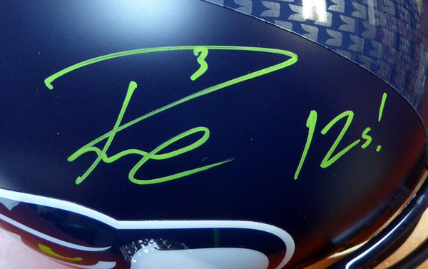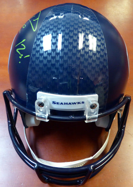 This is a Seattle Seahawks Full Size Replica Helmet that has been hand signed by Russell Wilson. Along with the autograph, this item also comes with the inscription which reads "12s". This one is signed in green. This item has the official tamper-proof Russell Wilson serial numbered hologram and matching certificate of authenticity.