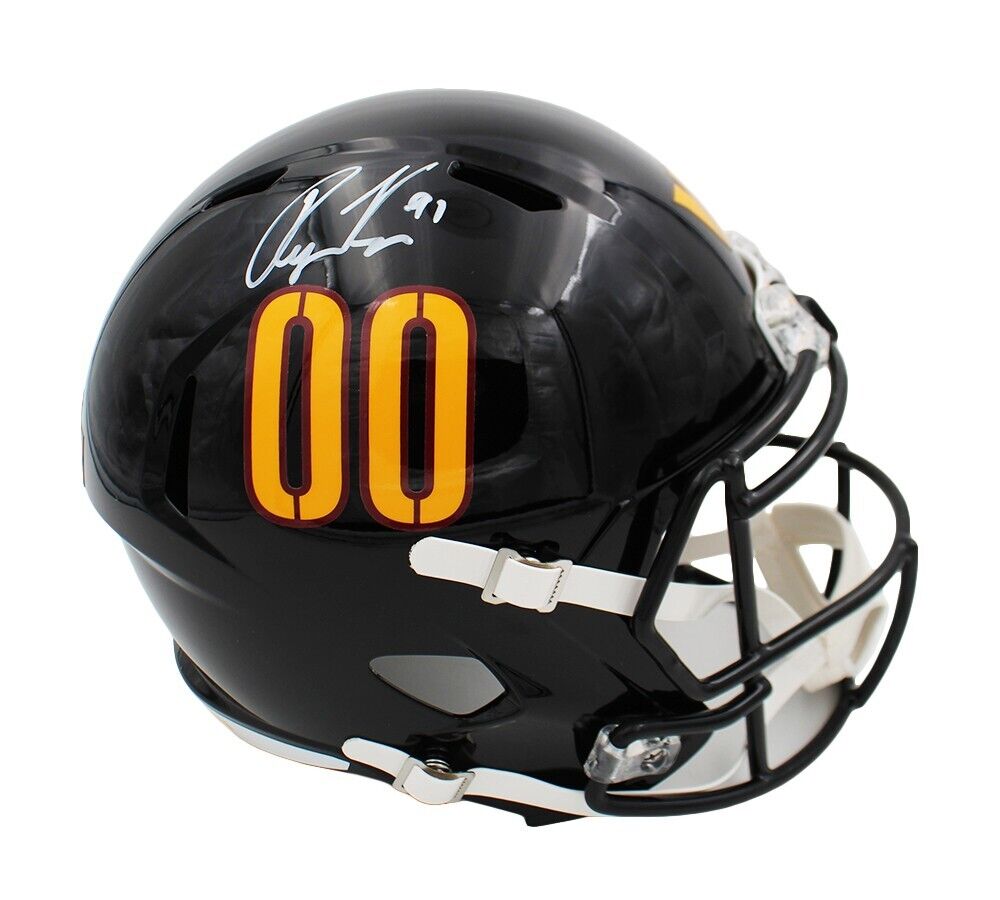 A Washington Commanders Speed Replica NFL Helmet hand signed by Ryan Kerrigan. The item and signature are in excellent condition. Ryan was a 1st round draft pick and a 4x Pro Bowler. He played for Purdue while in college. AUTHENTICATION: The item is accompanied by a Beckett Serial Numbered and Databased Hologram.
