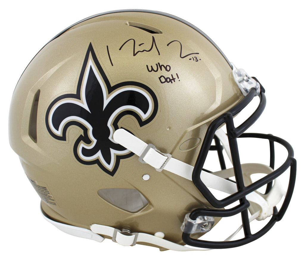 This Autographed Authentic Full Size Speed Proline Helmet with the inscription of "Who Dat" has been Personally Signed by Michael Thomas of the New Orleans Saints. This item is 100% Authentic to include a hologram by Beckett Authentication Services. This item will come with the new Beckett Authentication hologram that has a scannable QR code rather than the traditional COA. If you would like to have a COA, you are welcome to reach out to Beckett for a printed certification once you receive your item. This is a BAS Witnessed Protection Program item which means a Beckett Authentication Service representative was present when this item was being signed. This is a stock item. We conducted an autograph signing with Michael Thomas and we have several of these available. The one you will receive will be of equal quality to the one pictured. This item can be verified through BAS Witnessed.