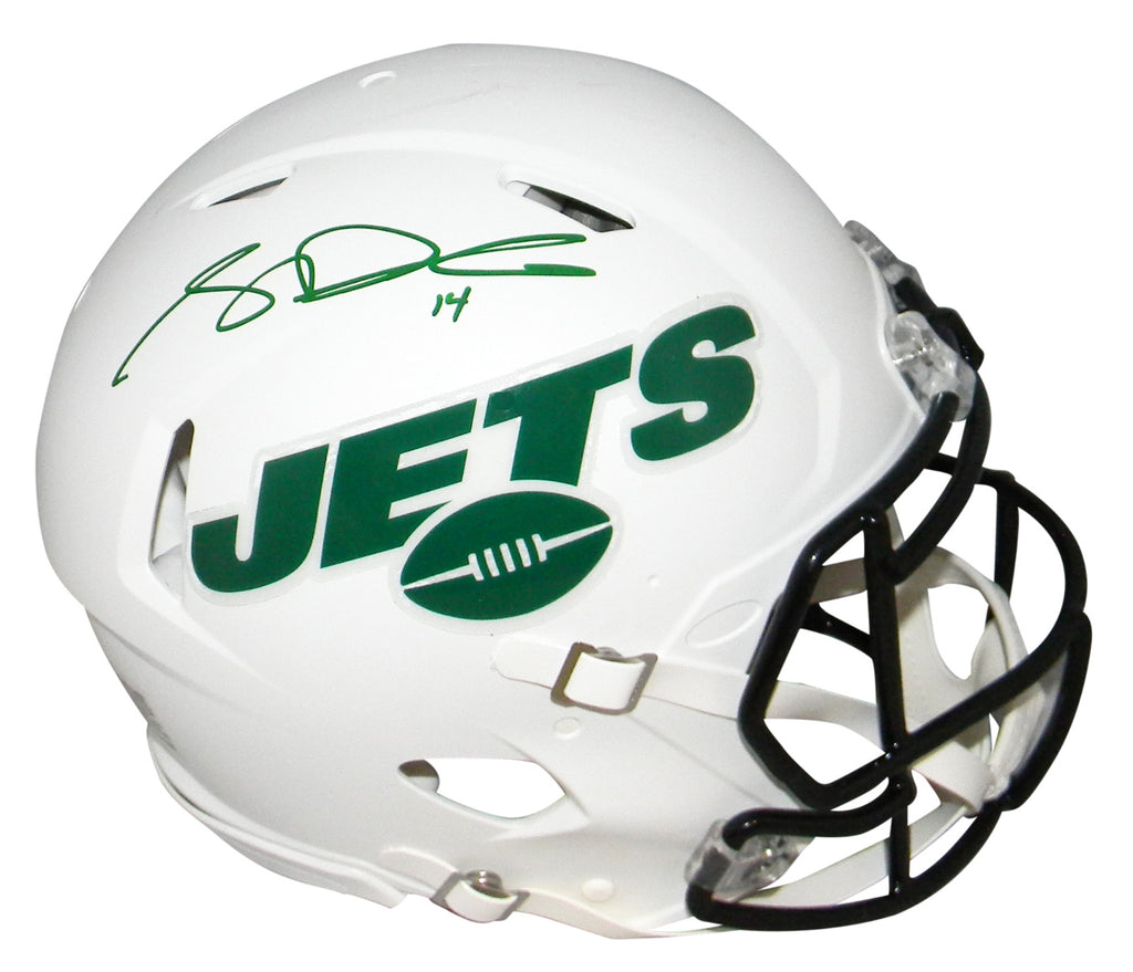 Sam Darnold, former quarterback for the New York Jets, has hand signed this Jets Riddell Speed Flat White full-size authentic helmet at a private signing. This helmet is fully padded inside like the ones worn on the field. This item comes with a certificate of authenticity (COA) from Beckett Authentication Services and was signed in the presence of one of their representatives. You will receive a serial-numbered COA along with a matching serial-numbered sticker on the helmet. The authenticity can be verified online by entering the serial number.Item pictured may not be the exact item you will receive. It will be similar quality, and we guarantee your satisfaction.
