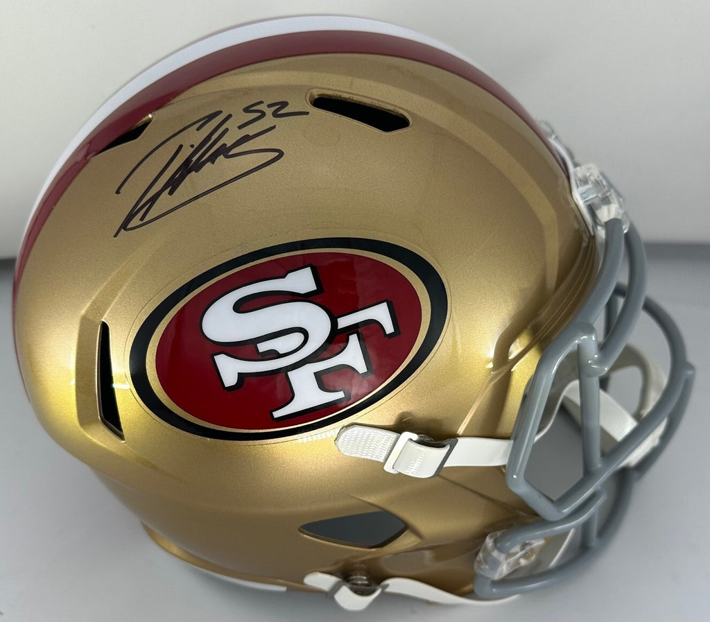 Riddell Full Size Replica speed Helmet hand signed by San Francisco 49ers Linebacker PATRICK WILLIS. The signature is in Black paint pen. This item was signed at a private signing and would make a great addition to any Lions collection! This item is guaranteed to be 100% authentic and will include a COA hologram from Beckett Authentication.