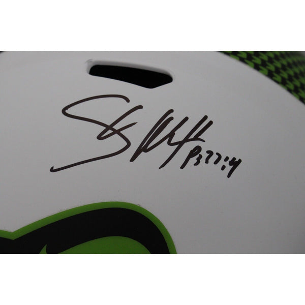 The number in the listing title is just an inventory sku for our records and is not the authentication number. The item pictured is a stock photo unless otherwise noted. This is a Seattle Seahawks Full Size Lunar Speed Replica Helmet that was personally autographed by Shaun Alexander. Includes a certificate of authenticity from Beckett Authentication Services (BAS) and Denver Autographs.