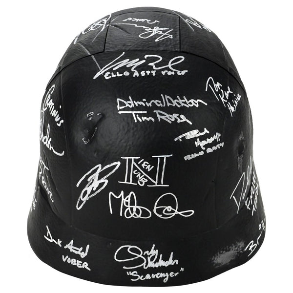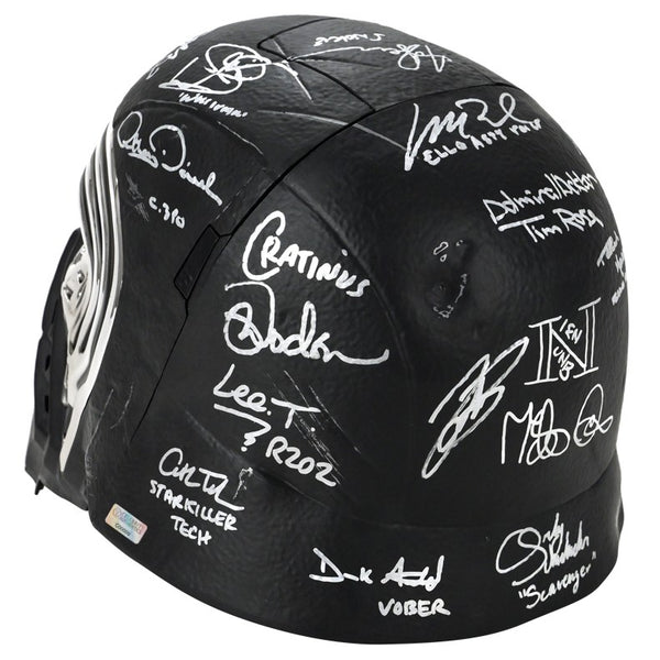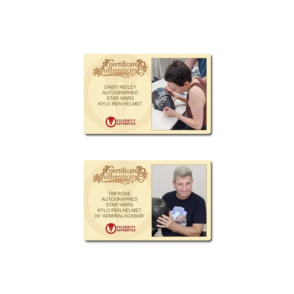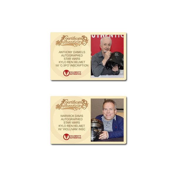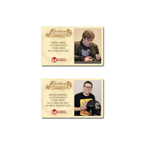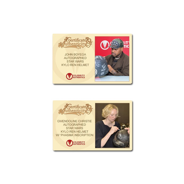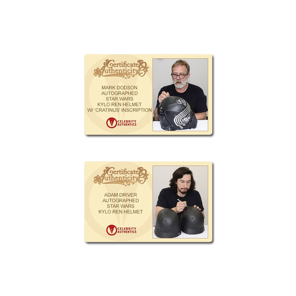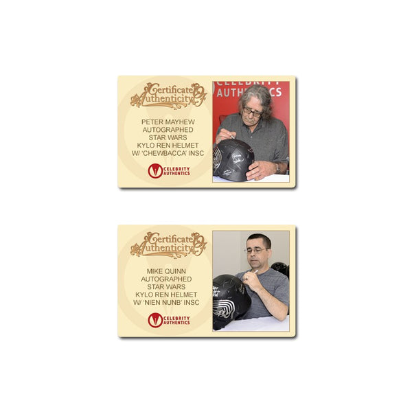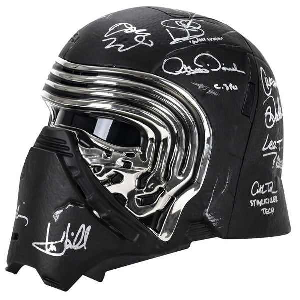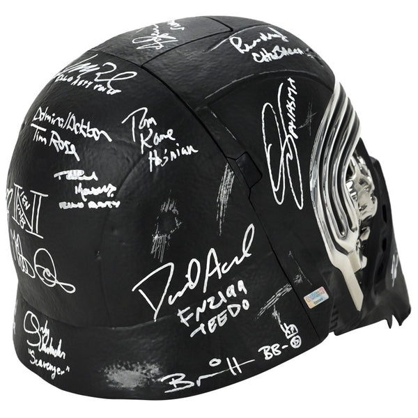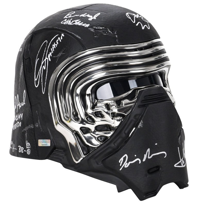 This Celebrity Authentics exclusive Hasbro The Black Series Star Wars The Force Awakens Kylo Ren Voice Changing Helmet has been personally hand-signed by twenty-one cast members including Daisy Ridley (Rey), Adam Driver (Kylo Ren), John Boyega (Finn), Gwendoline Christie (Captain Phasma), Mark Hamill (Luke Skywalker), Andy Serkis (Supreme Leader Snoke), Anthony Daniels (C-3PO), the late Peter Mayhew (Chewbacca), Warwick Davis (Wollivan), Brian Herring (BB-8), Lee Towersey (R2-D2), Tim Rose (Admiral Ackbar), Mike Quinn (Nien Nunb), Tom Kane (Hosnian), the late Mark Dodson (Cratinus), Catherine Taber (Starkiller Tech), Paul Kasey (Ello Asty), David Acord (FN-2199 + Teedo), Derek Arnold (Vober), Matthew Wood (Ello Asty Voice) and Orly Schuchmacher (Scavenger) during their signings with Celebrity Authentics. This realistically detailed, movie accurate 1:1 scale piece is from the Star Wars Black Series and features an electronic voice changing function. Ships affixed with the Celebrity Authentics serial-numbered and tamper evident Authentication Hologram and include Celebrity Authentics Certificates of Authenticity featuring a picture of each actor signing. While we are limited to 11 total listing images, you will receive Certificates of Authenticity for all 21 signers. A standout addition for the finest Star Wars collection! Please note: with multiples signed by the actor, a sample photo is used from stock to represent what you will receive. Exact autograph size and placement may vary.