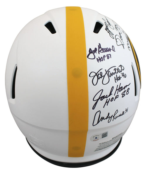 This Autographed Alternate Lunar Riddell Authentic Full Size Speed Proline Helmet with the inscription of "2x SB Champs (Russell), HOF 88 (Ham), HOF 90 (Lambert)" has been Personally Signed by Jack Lambert, Jack Ham, Andy Russell, Dermontti Dawson, Donnie Shell, Jerome Bettis, Joe Greene, John Stalworth, Rocky Bleier, Franco Harris, Lynn Swann, Mel Blount of the Pittsburgh Steelers. This item is 100% Authentic to include a hologram by Beckett Authentication Services. This item will come with the new Beckett Authentication hologram that has a scannable QR code rather than the traditional COA. If you would like to have a COA, you are welcome to reach out to Beckett for a printed certification once you receive your item. This is a BAS Witnessed Protection Program item which means a Beckett Authentication Service representative was present when this item was being signed. We conducted an autograph signing with Jack Lambert, Jack Ham, Andy Russell, Dermontti Dawson, Donnie Shell, Jerome Bettis, Joe Greene, John Stalworth, Rocky Bleier, Franco Harris, Lynn Swann & Mel Blount where multiples of the same item were signed. While the photographs are representative of this item, the size, placement and strength of the signature may vary. Each item is hand signed, therefore, each autograph is unique. This item can be verified through BAS Witnessed.