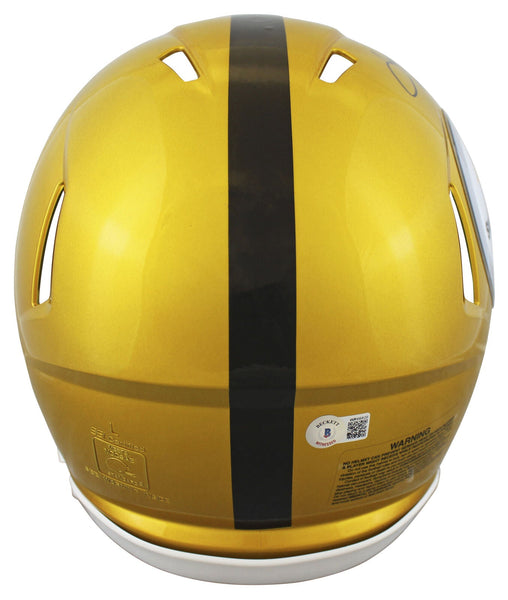 This Autographed Alternate Flash Riddell Authentic Full Size Speed Proline Helmet with the inscription of "HOF 87" has been Personally Signed by Joe Greene of the Pittsburgh Steelers. This item is 100% Authentic to include a Certificate of Authenticity (COA) / hologram by Beckett Authentication Services. This is a BAS Witnessed Protection Program item which means a Beckett Authentication Service representative was present when this item was being signed. We conducted an autograph signing with Joe Greene where multiples of the same item were signed. While the photographs are representative of this item, the size, placement and strength of the signature may vary. Each item is hand signed, therefore, each autograph is unique. This item can be verified through BAS Witnessed.