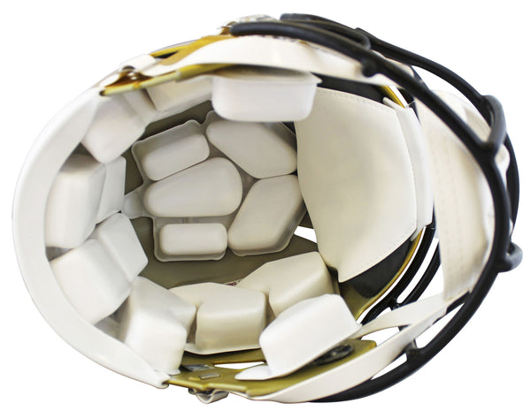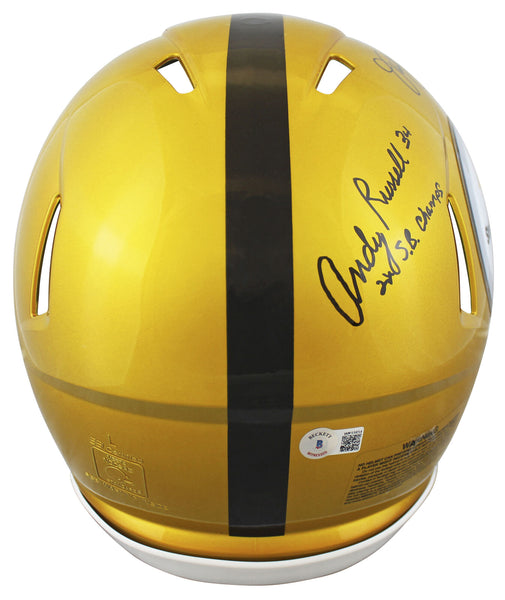 This Autographed Alternate Flash Riddell Authentic Full Size Speed Proline Helmet with the inscription of "2x SB Champs (Russell), HOF 88 (Ham), HOF 90 (Lambert)" has been Personally Signed by Jack Lambert, Jack Ham & Andy Russell of the Pittsburgh Steelers. This item is 100% Authentic to include a hologram by Beckett Authentication Services. This item will come with the new Beckett Authentication hologram that has a scannable QR code rather than the traditional COA. If you would like to have a COA, you are welcome to reach out to Beckett for a printed certification once you receive your item. This is a BAS Witnessed Protection Program item which means a Beckett Authentication Service representative was present when this item was being signed. We conducted an autograph signing with Jack Lambert, Jack Ham & Andy Russell where multiples of the same item were signed. While the photographs are representative of this item, the size, placement and strength of the signature may vary. Each item is hand signed, therefore, each autograph is unique. This item can be verified through BAS Witnessed.
