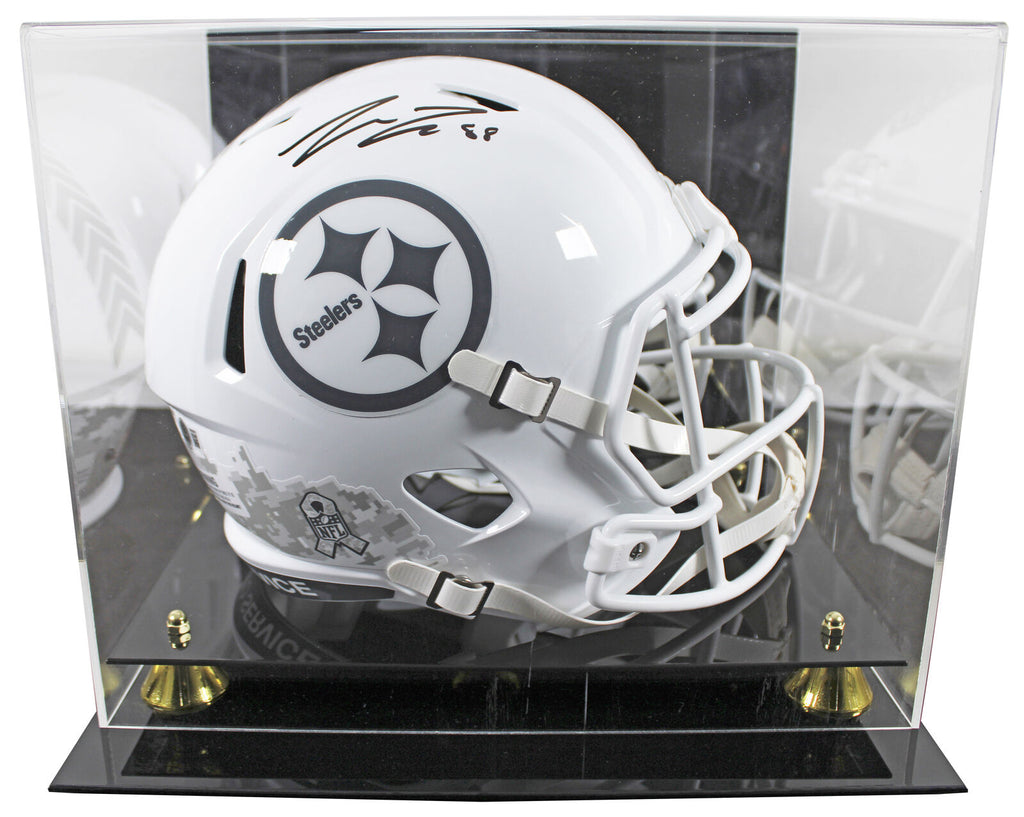 This Autographed Alternate 2024 Salute To Service III Riddell Full Size Speed Rep Helmet W/ Uv Mirrored Back Acrylic Display Case has been Personally Signed by Pat Freiermuth of the Pittsburgh Steelers. This item is 100% Authentic to include a hologram by Beckett Authentication Services. This item will come with an affixed Beckett Authentication Services (BAS) authentication sticker, which includes a scannable QR code to verify authenticity. Please note that Beckett no longer provides serial-numbered COA cards, and the attached BAS sticker will serve as the complete authentication for this item. This is a BAS Witnessed Protection Program item which means a Beckett Authentication Service representative was present when this item was being signed. We conducted an autograph signing with Pat Freiermuth where multiples of the same item were signed. While the photographs are representative of this item, the size, placement and strength of the signature may vary. Each item is hand signed, therefore, each autograph is unique. This item can be verified through BAS Witnessed.