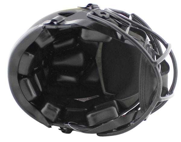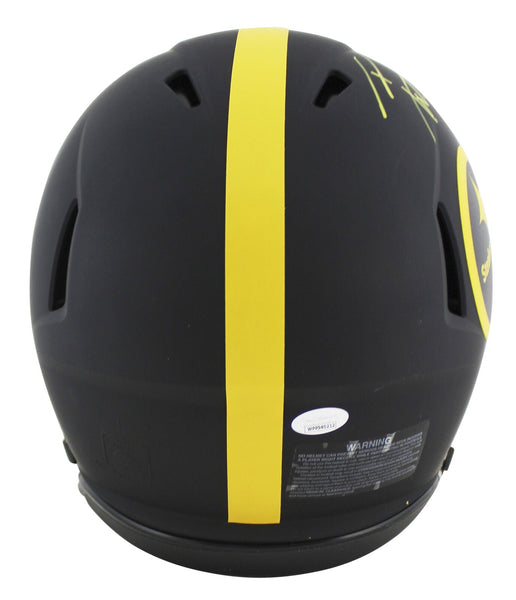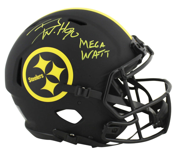 This Autographed Alternate Eclipse Riddell Authentic Proline F/S Speed Helmet with the inscription of "Mega Watt" has been Personally Signed by T.J. Watt of the Pittsburgh Steelers. This item is 100% Authentic to include a Certificate of Authenticity (COA) / hologram by JSA Witness. This is a JSA Witnessed Protection Program item which means a JSA representative was present when this item was being signed. This is a stock item. We conducted an autograph signing with T.J. Watt and we have several of these available. The one you will receive will be of equal quality to the one pictured. This item can be verified through JSA Witness.