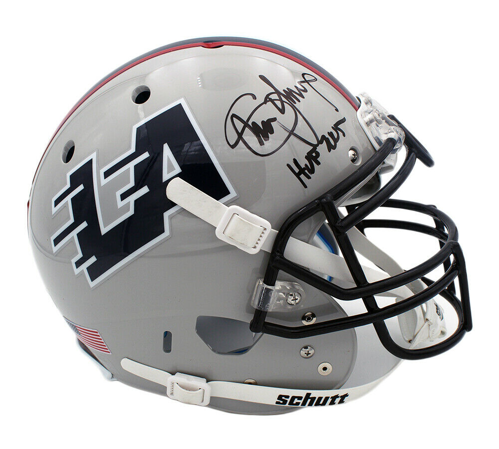 A Los Angeles Express Schutt Authentic USFL Helmet hand signed by Steve Young. The item and signature are in excellent condition. In additon to signing his name, Steve also inscribed "HOF 2005" on the item. Steve is a 3x Super Bowl Champion, 7x Pro Bowler, and is a member of the College Football Hall of Fame and the Pro Football Hall of Fame. AUTHENTICATION: The item is accompanied by a Certificate of Authenticity - Serial Numbered and Databased Hologram - Picture of Steve from the signing -