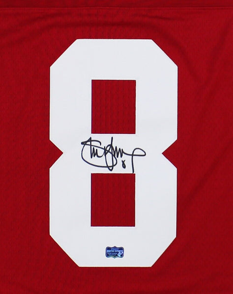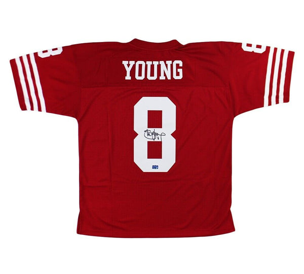 A San Francisco 49ers Mitchell & Ness Red Throwback XL NFL Jersey hand signed by Steve Young. The item and signature are in excellent condition. Steve is a 3x Super Bowl Champion, 7x Pro Bowler, and is a member of the College Football Hall of Fame and the Pro Football Hall of Fame. AUTHENTICATION: The item has been tagged with a SmarTag powered by Prova Technology, which gives you digital access to the items authentication records.