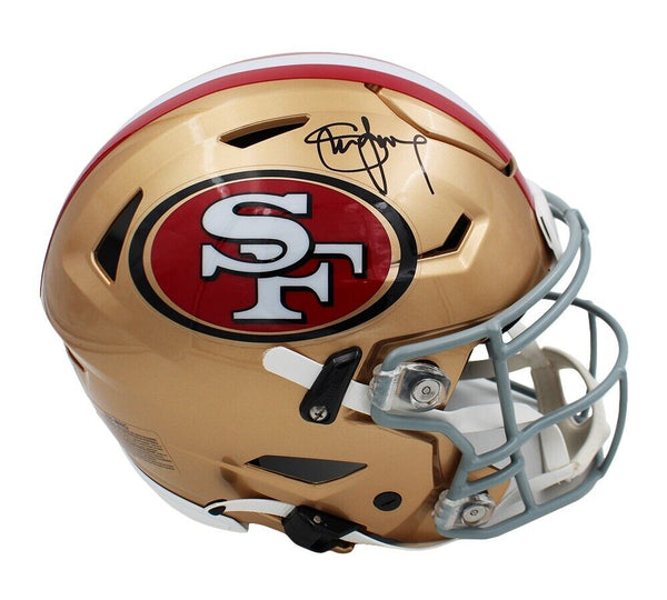 A San Francisco 49ers Speed Flex Authentic NFL Helmet hand signed by Steve Young. The item and signature are in excellent condition. Steve is a 3x Super Bowl Champion, 7x Pro Bowler, and is a member of the College Football Hall of Fame and the Pro Football Hall of Fame. AUTHENTICATION: Your item is tagged with a SmarTag powered by Prova Technology, which gives you digital access to your items authentication records, which includes a proof picture from the signing.