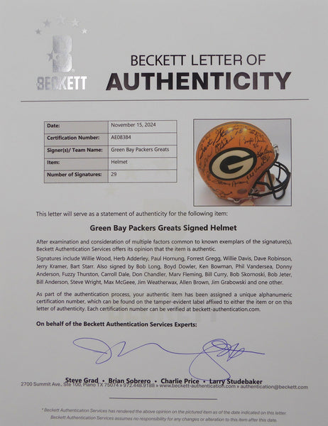 This is an Authentic Full Size Helmet that has been hand signed by 26 members of the 1966 Green Bay Packers Super Bowl I Champions team. Signatures include Bart Starr, Paul Hornung, Willie Wood, Herb Adderley, Forrest Gregg, Willie Davis, Dave Robinson, Jerry Kramer, Bob Long, Boyd Dowler, Ken Bowman, Phil Vandersea, Donny Anderson, Fuzzy Thurston, Carroll Dale, Don Chandler, Marv Flemming, Bill Curry, Bob Skornoski, Bob Jeter, Bill Anderson, Steve Wright, Max McGee, Jim Weatherwax, Allen Brown, Jim Grabowski and one other. This item has been certified authentic by Beckett Authentication (BAS) and comes with their tamper-proof hologram and matching full-page certificate of authenticity.