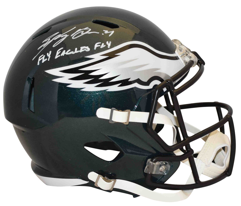 Sydney Brown, star safety for the Philadelphia Eagles, has hand signed this Eagles Riddell Speed full-size replica helmet at a private signing. He included the inscription "Fly Eagles Fly" with his signature. This item is authenticated by Beckett Authentication Services and was signed in the presence of one of their representatives. Their tamper-evident hologram featuring a QR code and serial number is on the item. The authenticity can be verified online by entering the serial number or scanning the QR code.Item pictured may not be the exact item you will receive. It will be similar quality, and we guarantee your satisfaction.