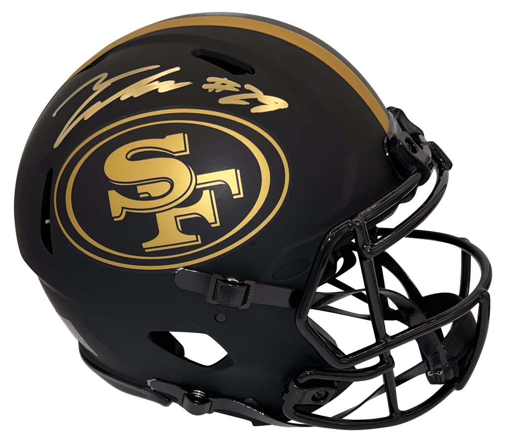 Talanoa Hufanga, star safety of the San Francisco 49ers, has hand signed this 49ers Riddell Speed Eclipse full-size authentic helmet at a private signing. This helmet is fully padded inside like the ones worn on the field. This item is authenticated by Beckett Authentication Services and was signed in the presence of one of their representatives. Their tamper-evident hologram featuring a QR code and serial number is on the item. The authenticity can be verified online by entering the serial number or scanning the QR code.Item pictured may not be the exact item you will receive. It will be similar quality, and we guarantee your satisfaction.