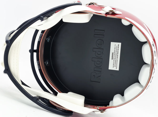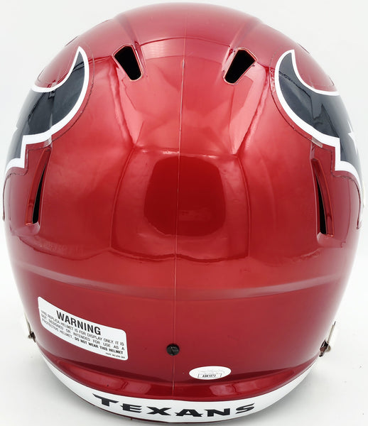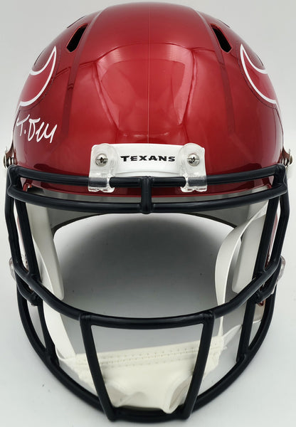 This is a Houston Texans Flash Red Full Size Speed Replica Helmet that has been hand signed by Tank Dell. This item has been certified authentic by JSA and comes with their tamper-proof hologram BUT is missing the matching certificate of authenticity.