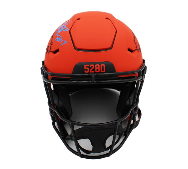 A Denver Broncos Speed Flex Authentic Rave NFL Helmet hand signed by Terrell Davis. The item and signature are in excellent condition. In addition to signing the item, Terrell inscribed "HOF 17" on the item. Terrell is a former NFL running back. He was drafted 6th round in the 1995 NFL Draft by the Denver Broncos. He is 2x Super Bowl Champion, Super Bowl (XXXII) MVP, 3x Pro Bowler, 3x First-Team All-Pro, and 1998 NFL MVP. AUTHENTICATION: Your item has been tagged with a SmarTag powered by Prova Technology, which gives you digital access to your items authentication records, including a proof picture from the signing.