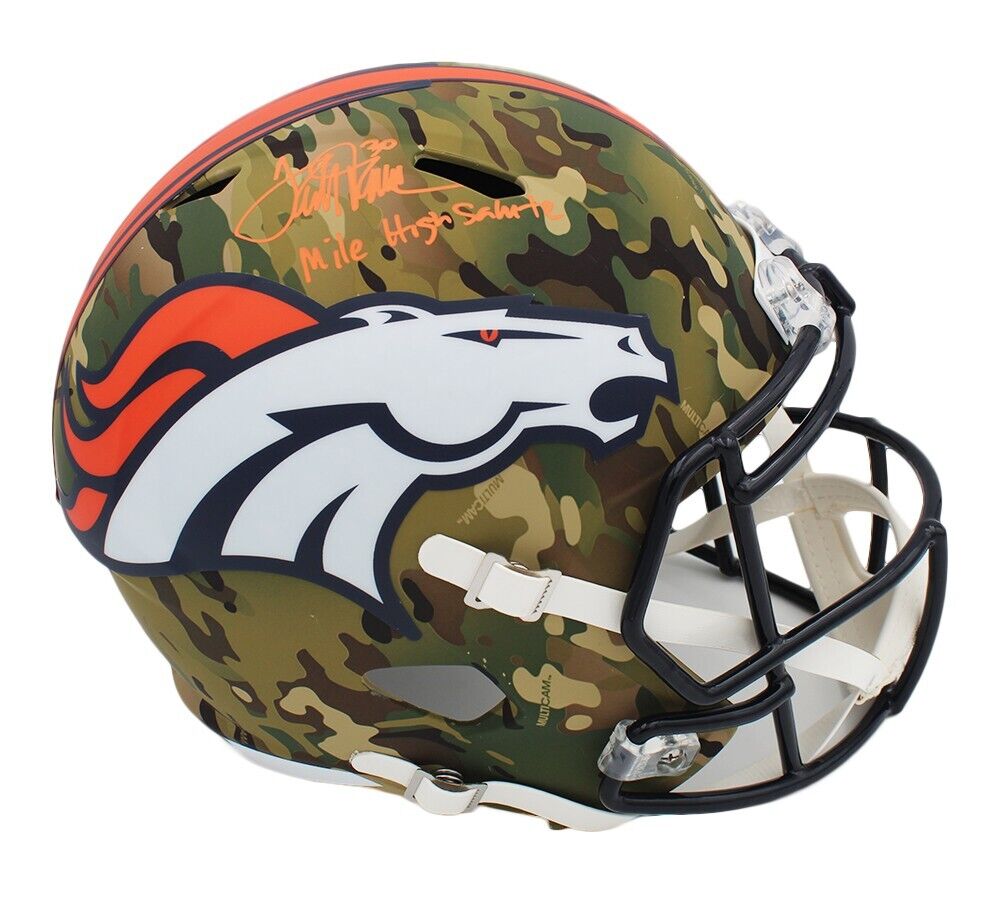 A Denver Broncos Speed Replica Camo NFL Helmet hand signed by Terrell Davis. The item and signature are in excellent condition. In addition to signing his name, Terrell inscribed "Mile High Salute" on the item. Terrell is a former NFL running back. He was drafted 6th round in the 1995 NFL Draft by the Denver Broncos. 2x Super Bowl Champion, Super Bowl (XXXII) MVP, 3x Pro Bowler, 3x First-Team All-Pro, 1998 NFL MVP. AUTHENTICATION: The item is accompanied by a Certificate of Authenticity - Serial Numbered and Databased Hologram - Picture of Terrell from the Signing