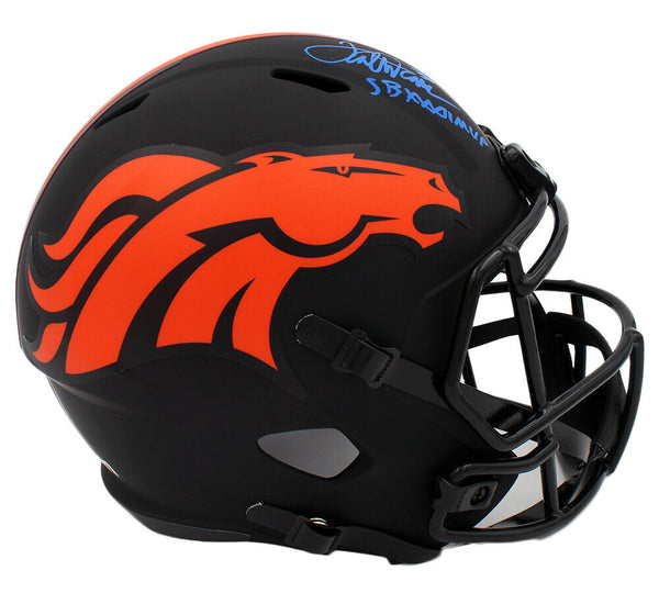 A Denver Broncos Speed Replica Eclipse NFL Helmet hand signed by Terrell Davis. The item and signature are in excellent condition. In addition to signing his name, Terrell inscribed "SB XXXII MVP" on the item. Terrell is a former NFL running back. He was drafted 6th round in the 1995 NFL Draft by the Denver Broncos. 2x Super Bowl Champion, Super Bowl (XXXII) MVP, 3x Pro Bowler, 3x First-Team All-Pro, 1998 NFL MVP. AUTHENTICATION: The item is accompanied by a Terrell Davis Exclusive Certificate of Authenticity - Terrell Davis Exclusive Serial Numbered and Databased Hologram - Picture of Terrell from the Signing -