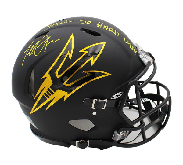 A Arizona Cardinals Speed Authentic Black NFL Helmet hand signed by Terrell Davis. The item and signature are in excellent condition. In addition to signing his name, Terrell inscribed "Mile High Salute" on the item. Terrell is a former NFL running back. He was drafted 6th round in the 1995 NFL Draft by the Denver Broncos. 2x Super Bowl Champion, Super Bowl (XXXII) MVP, 3x Pro Bowler, 3x First-Team All-Pro, 1998 NFL MVP. AUTHENTICATION:- The item is accompanied by a Beckett Serial Numbered & Databased Hologram