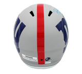 A New York Giants Speed Replica AMP NFL Helmet hand signed by Tiki Barber. The item and signature are in excellent condition. Tiki is a former football running back who played for the New York Giants(NFL) for ten seasons. He played college football for the University of Virginia. Barber was drafted by the Giants in the second round of the 1997 NFL Draft, and played his entire professional career for them. Barber retired from the NFL at the end of the 2006 NFL postseason as the Giants' all-time rushing and reception leader. Barber was inducted into the Virginia Sports Hall of Fame in 2011. AUTHENTICATION: The item is accompanied by a JSA Certificate of Authenticity - JSA serial Numbered and Databased Hologram -