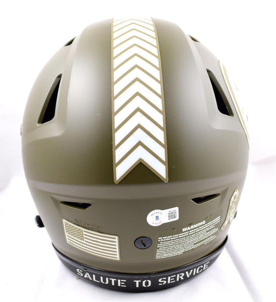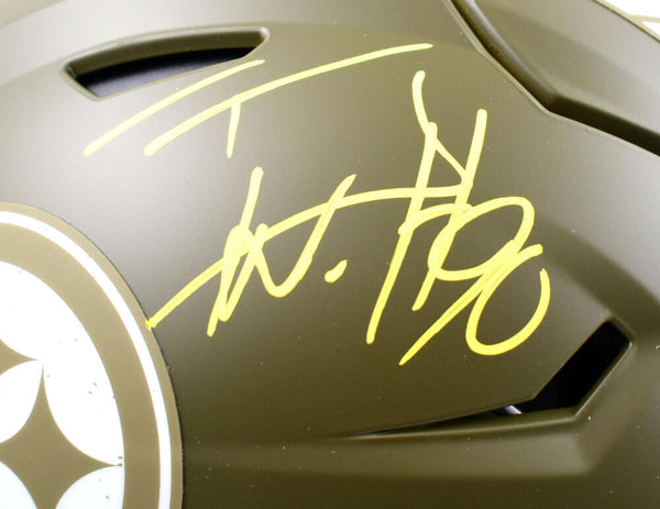 TJ Watt Autographed Pittsburgh Steelers F/S Salute to Service Speed Flex Helmet- Beckett W Hologram *Yellow This is a hand autograph of TJ Watt of the Pittsburgh Steelers on a Riddell Football Full Size Salute to Service Speed Flex Authentic Helmet. This item has a Beckett Witnessed Authentication, which comes with a numbered hologram and a QR code for verification. You can view this item on the Beckett Authentication website. It was signed either at a public autograph appearance or a private signing. This is a stock photo of the item. Although you may not receive this exact item, the item you receive is virtually identical and brand new in great shape.