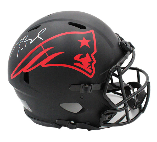 A New England Patriots Speed Authentic Eclipse NFL Helmet hand signed by Tom Brady. The item and signature are in excellent condition. Tom is a quarterback for the Tampa Bay Buccaneers. He spent the first 20 seasons of his career with the New England Patriots, playing in nine Super Bowls and winning six of them (XXXVI, XXXVIII, XXXIX, XLIX, LI, and LIII), both of which are the most of any player in NFL history. He has won a record four Super Bowl MVP awards (XXXVI, XXXVIII, XLIX, and LI) as well as three NFL MVP awards (2007, 2010, 2017). AUTHENTICATION: The item is accompanied by a Fanatics Authentics Certificate of Authenticity - Fanatics Authentic Serial Numbered and Databased Hologram