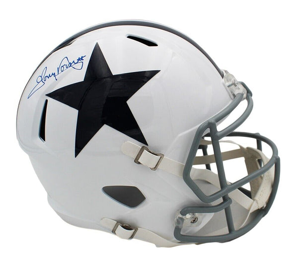 A Dallas Cowboys Speed Replica Throwback 1960-1963 NFL Helmet hand signed by Tony Dorsett. The item and signature are in excellent condition. Tony is a Heisman Trophy winner, Pro Bowler, All Pro, Super Bowl Champion as well as NCAA and NFL Hall of Fame Inductee. AUTHENTICATION: The item is accompanied by a Beckett Serial Numbered and Databased Hologram.