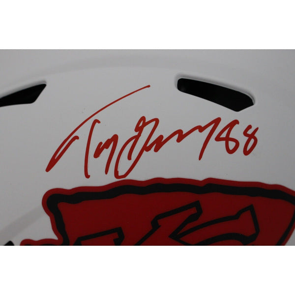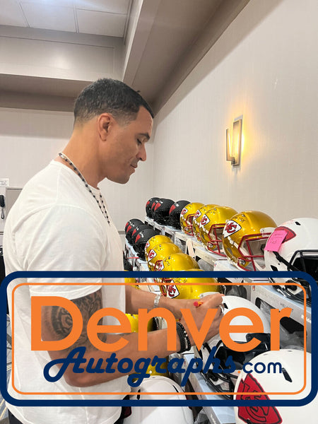 The number in the listing title is just an inventory sku for our records and is not the authentication number. The item pictured is a stock photo unless otherwise noted. This is a Kansas City Chiefs Authentic Full Size Lunar Helmet that was personally autographed by Tony Gonzalez. Includes a certificate of authenticity from Beckett Authentication Services (BAS) and Denver Autographs.