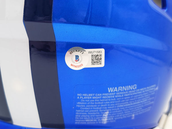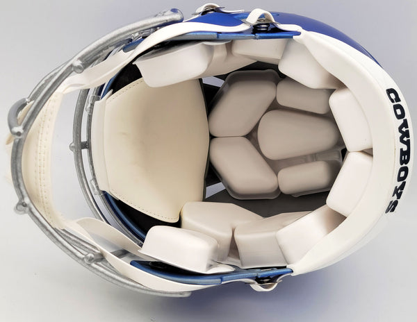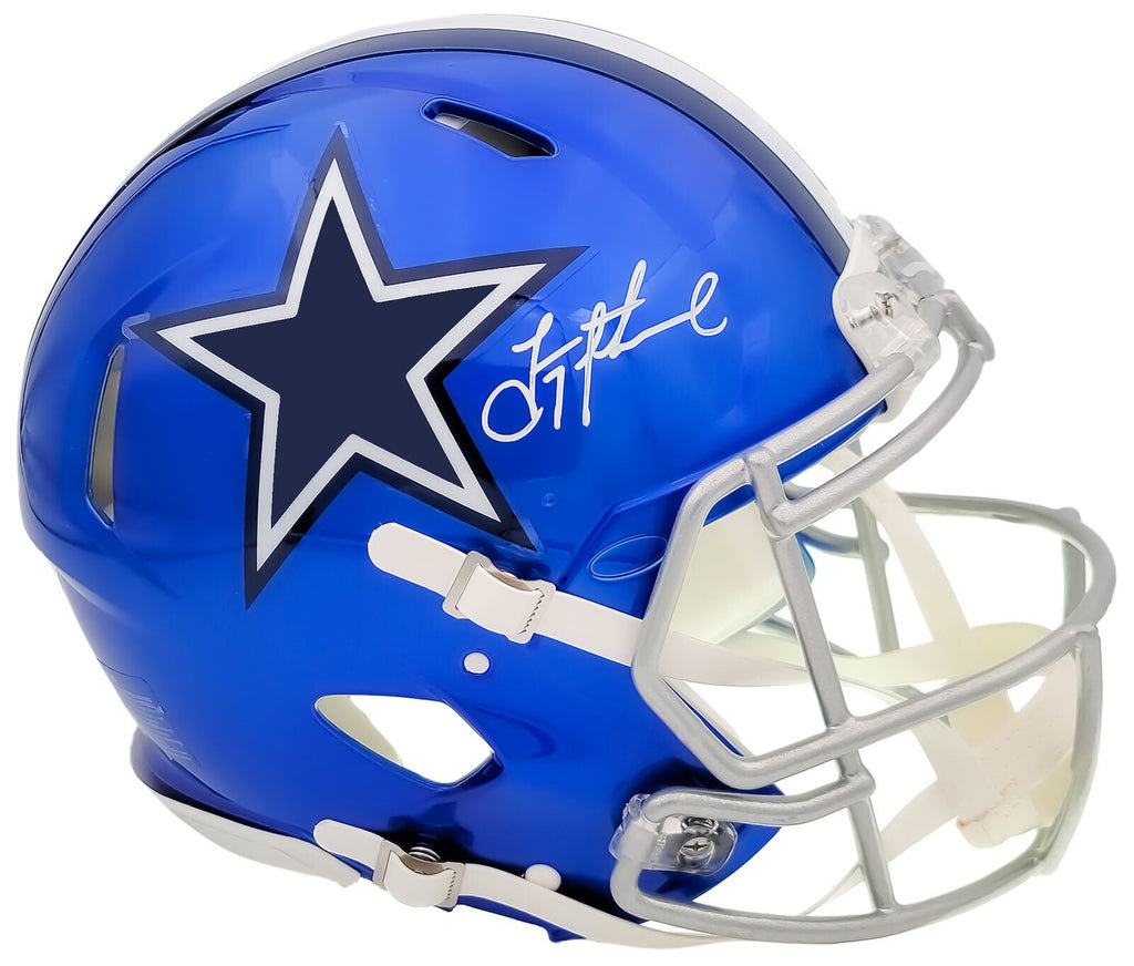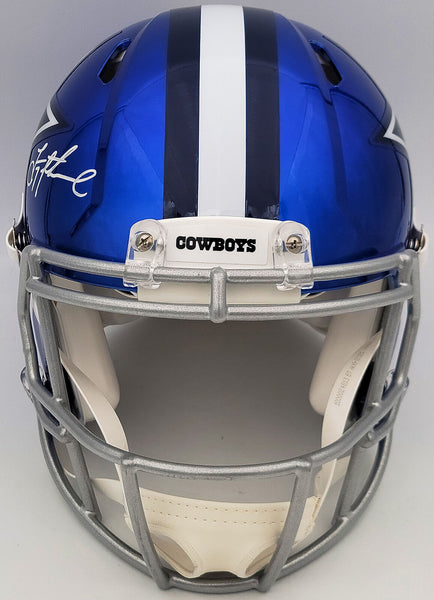 This is a Dallas Cowboys Flash Blue Full Size Authentic Speed Helmet that has been hand signed by Troy Aikman. The Flash helmets are very delicate and often have some marks or scratches on them. This item has been certified authentic by Beckett Authentication (BAS) and comes with their tamper-proof QR Code sticker that can be verified on the Beckett-authentication.com.
