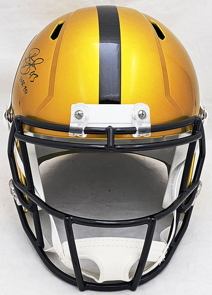 This is a Pittsburgh Steelers Flash Yellow Full Size Replica Speed Helmet that has been hand signed by Troy Polamalu. The Flash helmets are delicate and may have some marks or scratches on them. This item was inscribed "HOF 20." This item has been witnessed and certified authentic by Beckett Authentication (BAS) and comes with their tamper-proof witness sticker. Beckett Authentication has recently changed their physical certificate card policy where they no longer match their tamper-proof sticker with a physical certificate. A certificate can be printed on Beckett's website for the matching authentication number.