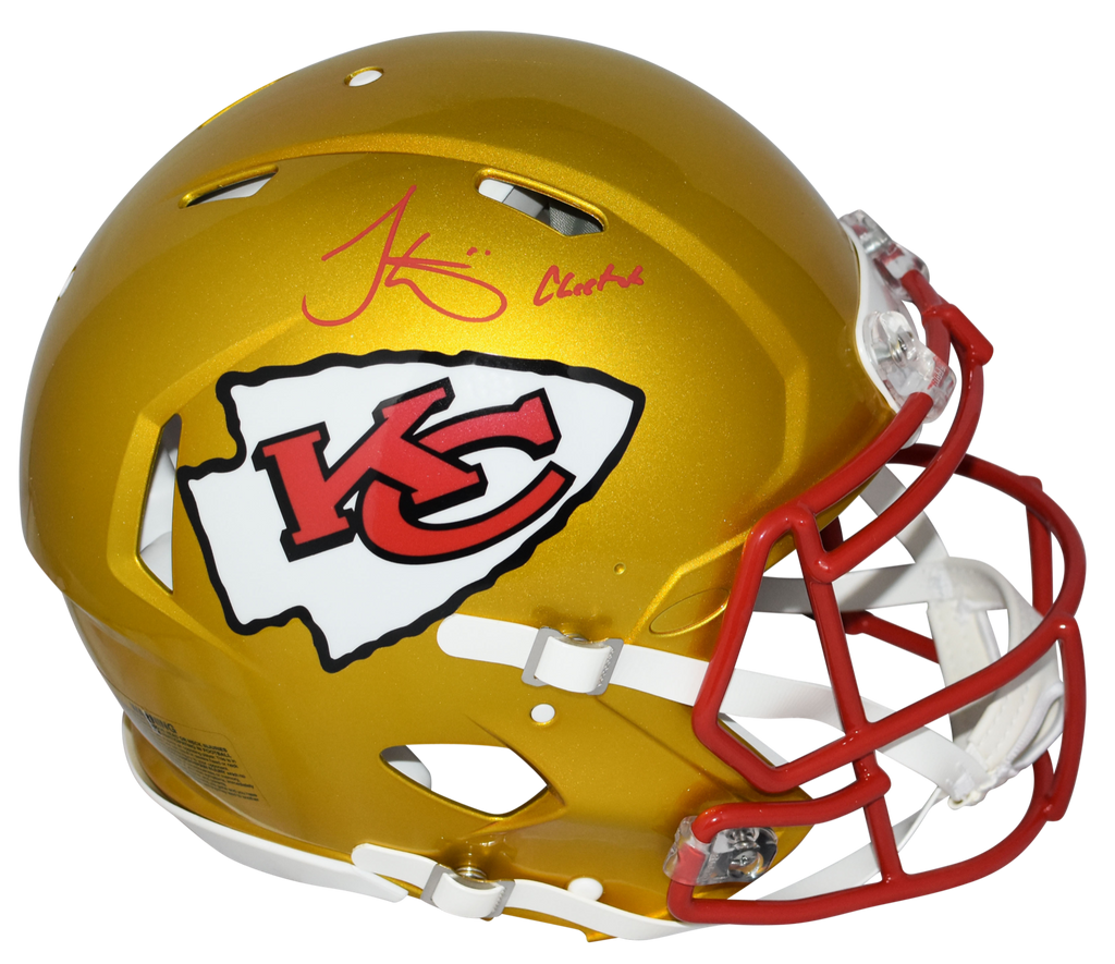 Tyreek Hill, Pro Bowl wide receiver for the Kansas City Chiefs, has hand signed this Chiefs Riddell Speed Flash full-size authentic helmet at a private signing. He included the inscription "Cheetah". This helmet is fully padded inside like the ones worn on the field. This item is authenticated by Beckett Authentication Services and was signed in the presence of one of their representatives. Their tamper-evident hologram featuring a QR code and serial number is on the item. The authenticity can be verified online by entering the serial number or scanning the QR code.Item pictured may not be the exact item you will receive. It will be similar quality, and we guarantee your satisfaction.