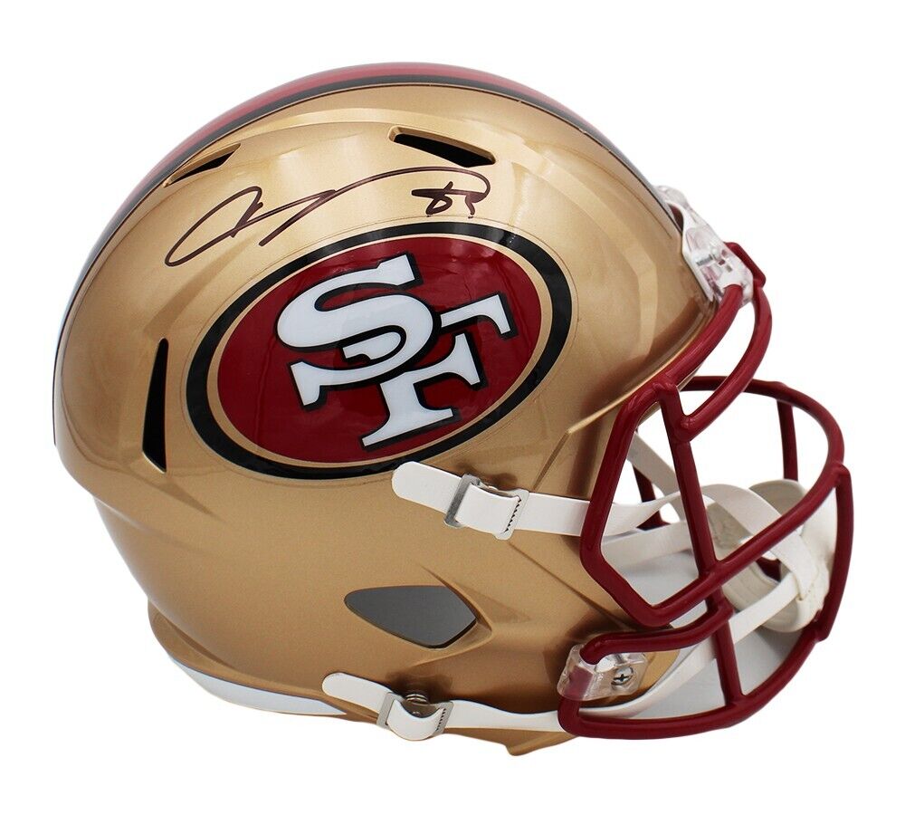 A San Francisco 49ers Speed Replica Throwback 1996-2008 NFL Helmet hand signed by Vernon Davis. The item and signature are in excellent condition. Vernon was drafted into the NFL in 2006, by the San Francisco 49ers. He is a Super Bowl Champion, Second-Team All-Pro, and a 2x Pro Bowler. AUTHENTICATION: The item is accompanied by a Beckett Serial Numbered and Databased Hologram.