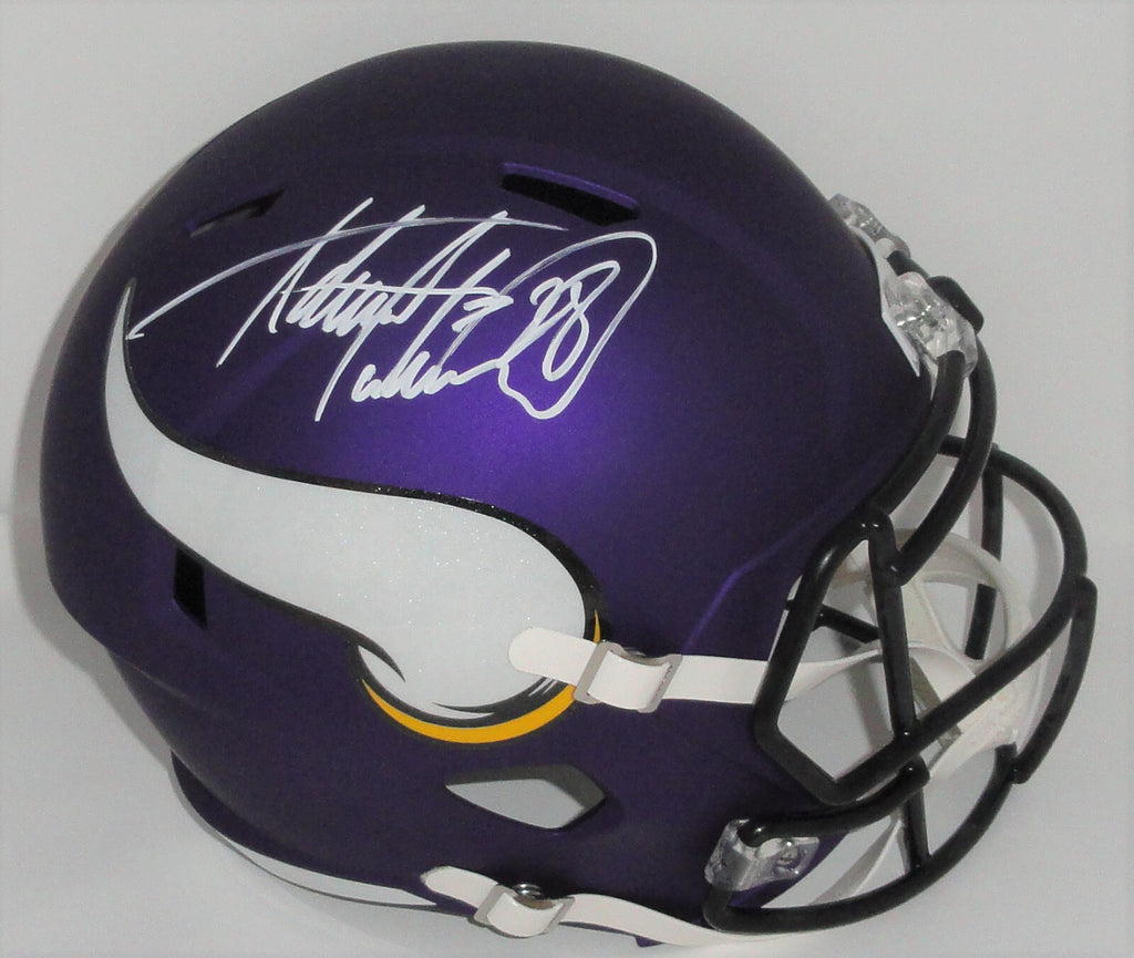Minnesota Vikings Full Size Replica Speed Helmet hand signed by Vikings future Hall of Famer ADRIAN PETERSON. The signature is in White paint pen. It was signed at a private signing with us and would make a great addition to any Vikings collection! This autograph is guaranteed to be 100% authentic and will include a COA from JSA (James Spence Authentication).
