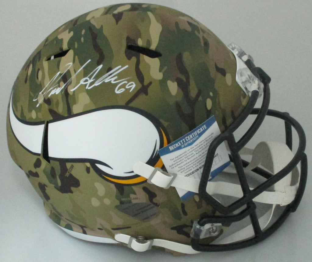 Riddell Full Size CAMO Replica Helmet hand signed by Minnesota Vikings legend JARED ALLEN. The signature is in White Paint Pen. This item was signed at a private signing with us and would make a great addition to any Allen or Vikings collection! This autograph is guaranteed to be 100% authentic and will include a COA from Beckett Authentication.