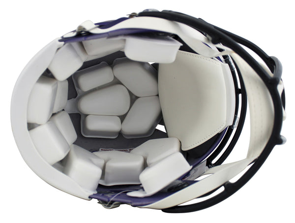 This Autographed Authentic Full Size Speed Proline Helmet has been Personally Signed by Justin Jefferson of the Minnesota Vikings. This item is 100% Authentic to include a Certificate of Authenticity (COA) / hologram by Beckett Authentication Services. This is a BAS Witnessed Protection Program item which means a Beckett Authentication Service representative was present when this item was being signed. This is a stock item. We conducted an autograph signing with Justin Jefferson and we have several of these available. The one you will receive will be of equal quality to the one pictured. This item can be verified through BAS Witnessed.