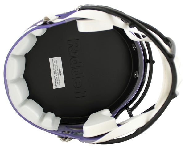 This Autographed Full Size Speed Rep Helmet has been Personally Signed by Randy Moss of the Minnesota Vikings. This item is 100% Authentic to include a hologram by Beckett Authentication Services. This item will come with an affixed Beckett Authentication Services (BAS) authentication sticker, which includes a scannable QR code to verify authenticity. Please note that Beckett no longer provides serial-numbered COA cards, and the attached BAS sticker will serve as the complete authentication for this item. This is a BAS Witnessed Protection Program item which means a Beckett Authentication Service representative was present when this item was being signed. We conducted an autograph signing with Randy Moss where multiples of the same item were signed. While the photographs are representative of this item, the size, placement and strength of the signature may vary. Each item is hand signed, therefore, each autograph is unique. This item can be verified through BAS Witnessed.