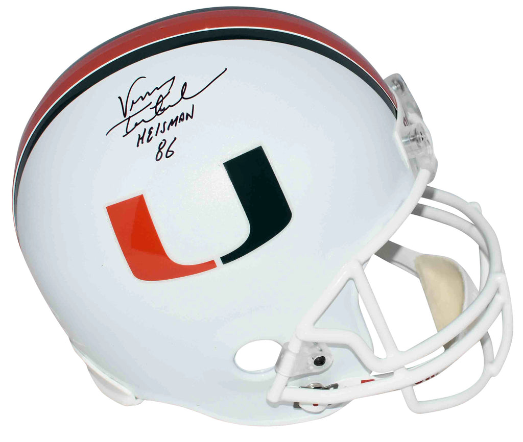 Vinny Testaverde, former Heisman Trophy winning quarterback for the Hurricanes, has hand signed this Miami Riddell full-size replica helmet at a private signing. He included the inscription "Heisman 86". This item comes with a certificate of authenticity (COA) from JSA - James Spence Authentication and was signed in the presence of one of their representatives. You will receive a serial-numbered COA along with a matching serial-numbered sticker on the helmet. The authenticity can be verified online by entering the serial number.Item pictured may not be the exact item you will receive. It will be similar quality, and we guarantee your satisfaction.
