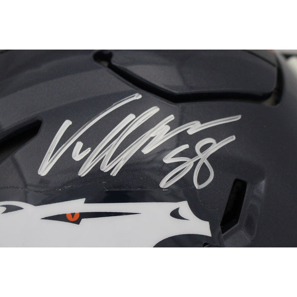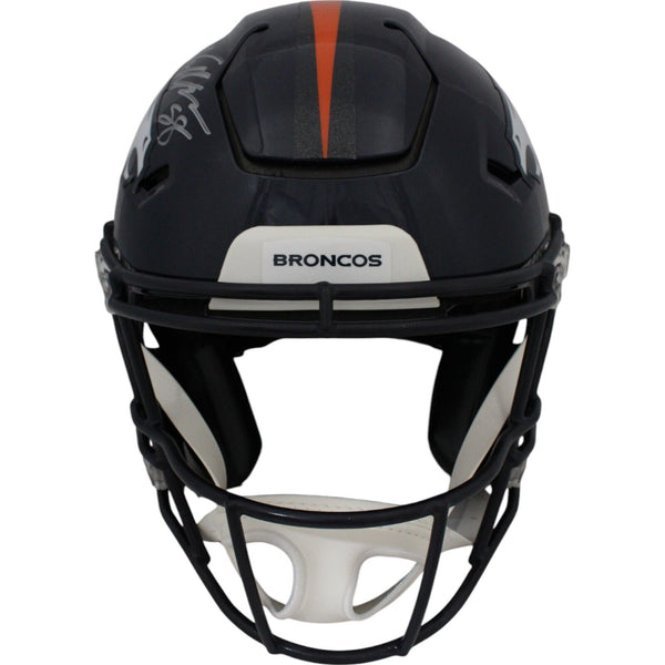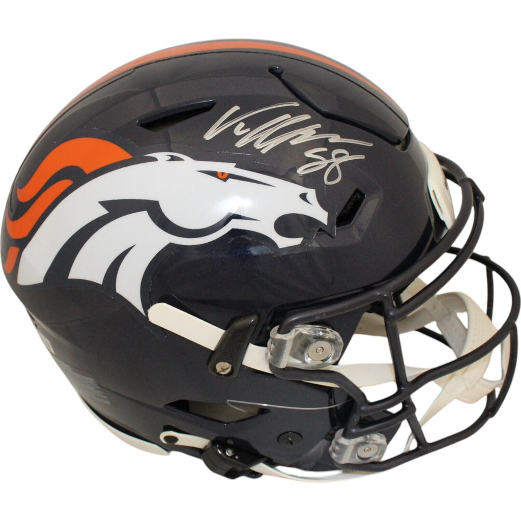 The number in the listing title is just an inventory sku for our records and is not the authentication number. The item pictured is a stock photo unless otherwise noted. This is a Denver Broncos Throwback 1997-2023 SpeedFlex Full Size Helmet that was personally autographed by Von Miller. Includes a certificate of authenticity from Beckett Authentication Services (BAS) and Denver Autographs.