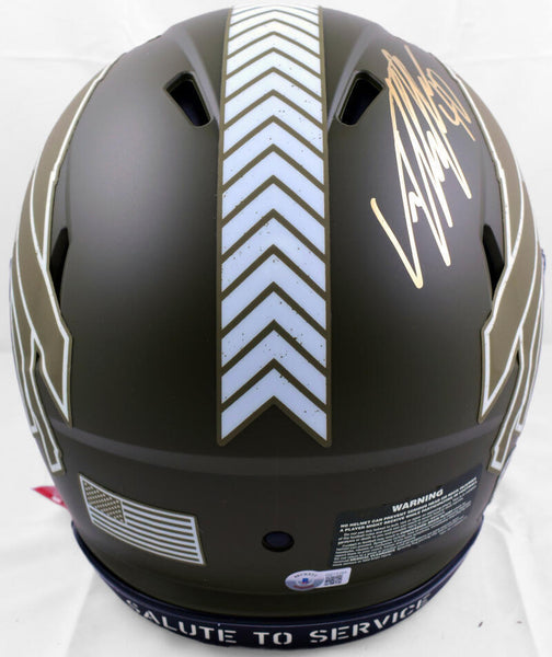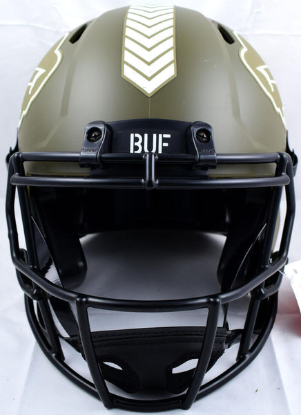 Von Miller Autographed Buffalo Bills F/S Salute To Service Speed Authentic Helmet-Beckett W Hologram *Gold This is a hand autographed Helmet of Von Miller of the Buffalo Bills. This is a Riddell Football Full Size Salute to Service Speed Authentic Helmet. This item has a Beckett Witnessed Authentication, which comes with a numbered sticker hologram and a QR code for verification. You can view this item on the Beckett website and it shows when and where the item was signed. It was signed either at a public autograph appearance or a private signing. This is a stock photo of the item. Although you may not receive this exact item, the item you receive is virtually identical and brand new in great shape.