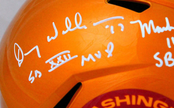 Williams/Rypien/Riggins Autographed WFT F/S Flash Speed Helmet W/SB MVP-Beckett W Hologram *White This is a hand autographed Helmet of Doug Williams, Mark Rypien and John Riggins of the Washington Football Team. This is a Riddell Football Full Size Flash Speed Replica Helmet. This item has a Beckett Witnessed Authentication, which comes with a numbered sticker hologram and a generic Beckett Certificate of Authenticity. You can view this item on the Beckett website and it shows when and where the item was signed. It was signed either at a public autograph appearance or a private signing. This is a stock photo of the item. Although you may not receive this exact item, the item you receive is virtually identical and brand new in great shape.