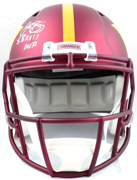 Williams Rypien Riggins Autographed Commanders F/S Speed Helmet W/SB MVP-Beckett W Hologram *White This is a hand autograph Helmet of Doug Williams, Mark Rypien and John Riggins of the Washington Commanders. This is a Riddell Football Full Size Speed Replica Helmet. Inscribed SB MVP. This item has a Beckett Witnessed Authentication, which comes with a Beckett numbered sticker hologram and a QR code for verification. You can view this item on the Beckett website and it shows when and where the item was signed. It was signed either at a public autograph appearance or a private signing. This is a stock photo of the item. Although you may not receive this exact item, the item you receive is virtually identical and brand new in great shape.