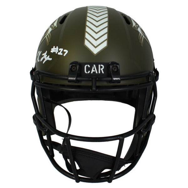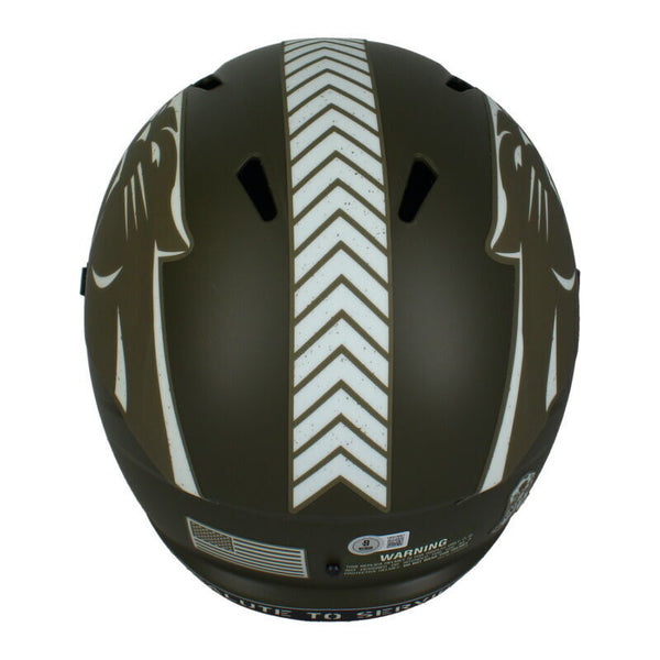 This Carolina Panthers Salute to Service full size replica Riddell Speed helmet has been personally hand-signed by Xavier Leggette. It comes with an individually numbered, tamper-evident hologram from Beckett Authentic. To ensure authenticity, the hologram can be reviewed online. This process helps to ensure that the product purchased is authentic and eliminates any possibility of duplication or fraud.