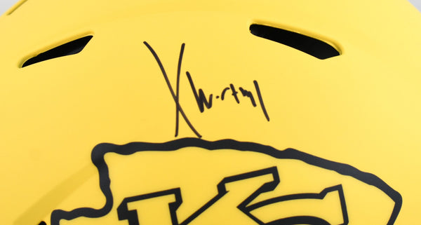 This is a Xavier Worthy of the Kansas City Chiefs autographed Riddell football full size Rave Speed Authentic helmet. This item has a Fanatics Authentication, which comes with a numbered hologram and a QR code for verification. You can view this item on the Fanatics Authentication website. It was signed either at a public autograph appearance or a private signing. This is a stock photo of the item. Although you may not receive this exact item, the item you receive is virtually identical, brand new, and in great shape. *Autograph location may vary* This is a Xavier Worthy of the Kansas City Chiefs autographed Riddell football full size Rave Speed Authentic helmet. This item has a Fanatics Authentication, which comes with a numbered hologram and a QR code for verification. You can view this item on the Fanatics Authentication website. It was signed either at a public autograph appearance or a private signing. This is a stock photo of the item. Although you may not receive this exact item, the item you receive is virtually identical, brand new, and in great shape. *Autograph location may vary*