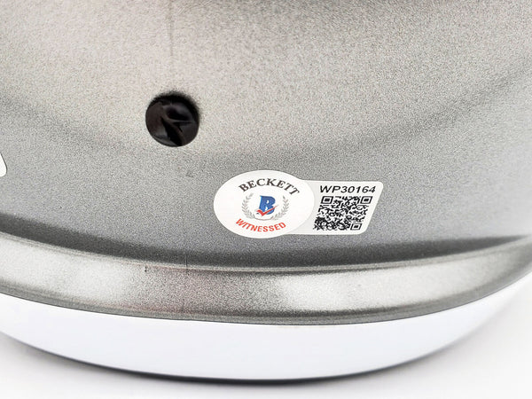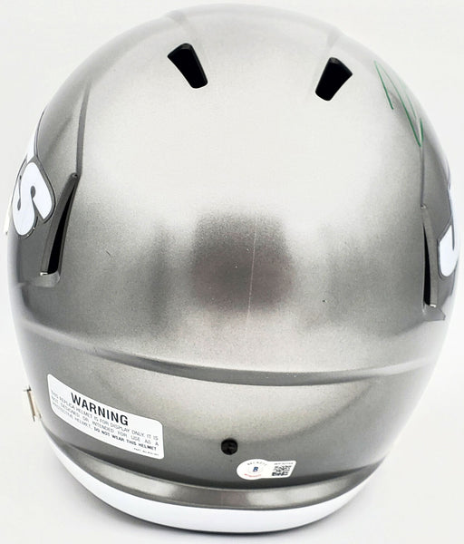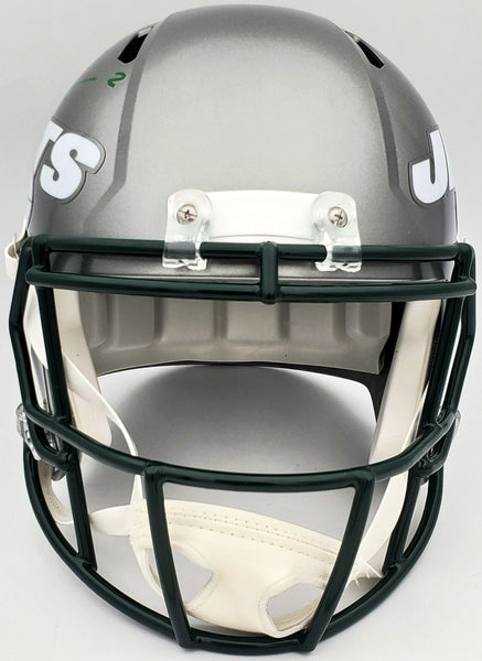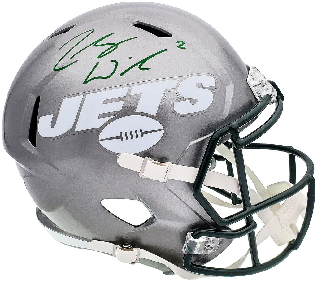 This is a New York Jets Flash Silver Full Size Replica Speed Helmet that has been hand signed by Zach Wilson. The Flash helmets are very delicate and often have some marks or scratches on them. This item has been certified authentic by Beckett Authentication (BAS) and comes with their tamper-proof QR Code sticker that can be verified on the Beckett-authentication.com.