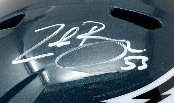 Featured is a Zack Baun signed Philadelphia Eagles full size speed replica helmet. This helmet has been hand signed by Baun and comes with the Beckett hologram and certificate of authenticity. This helmet would make a great addition to any sports memorabilia collection! SPECIFICATIONS Autographed By: Zack Baun Team: Philadelphia Eagles Sport: Football Authentication: Beckett